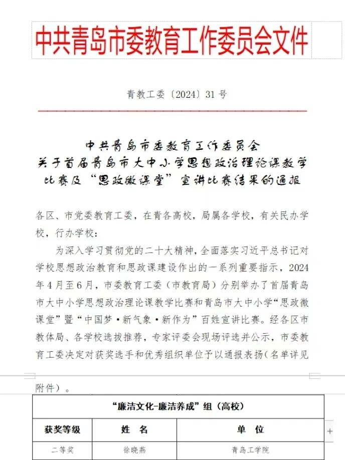 近日,中共青岛市委教育工作委员会对首届青岛市大中小学思想政治理论课教学比赛及大中小学“思政微课堂”比赛结果进行了通报。公司党总支副书记徐晓燕在“清廉校园”组别中荣获二等奖。